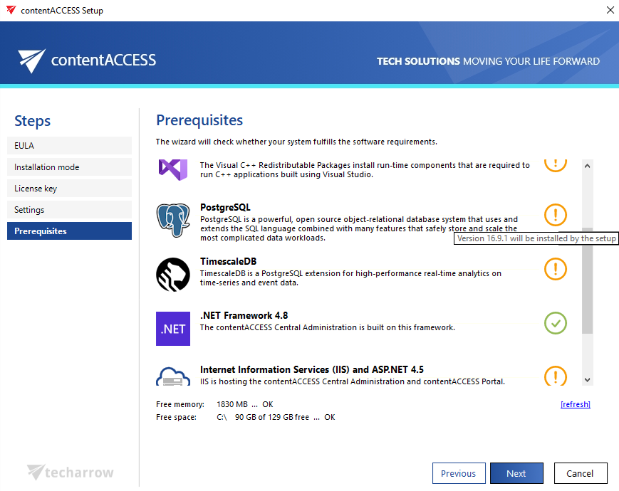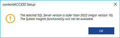 System Insights is compatible with both MSSQL and PostgreSQL databases, although PostgreSQL is recommended because the TimescaleDB extension is ideally suited for this type of workload. If selected during first installation, contentACCESS automatically installs PostgreSQL and creates the required database.