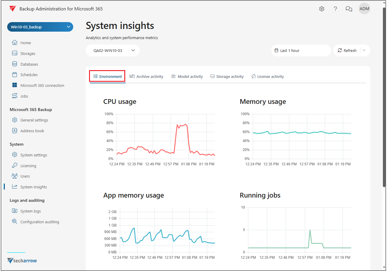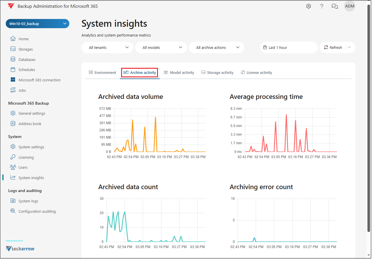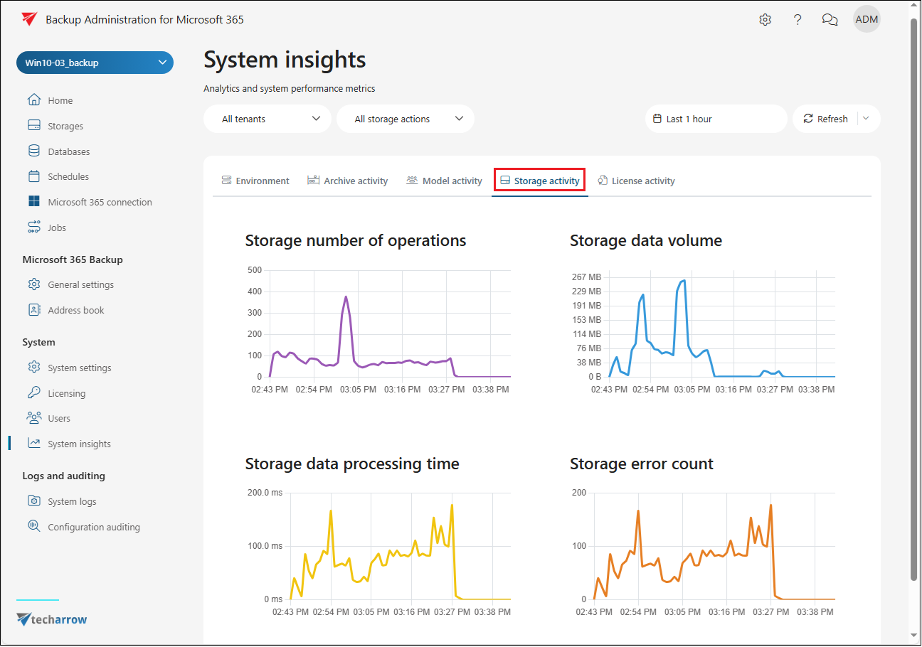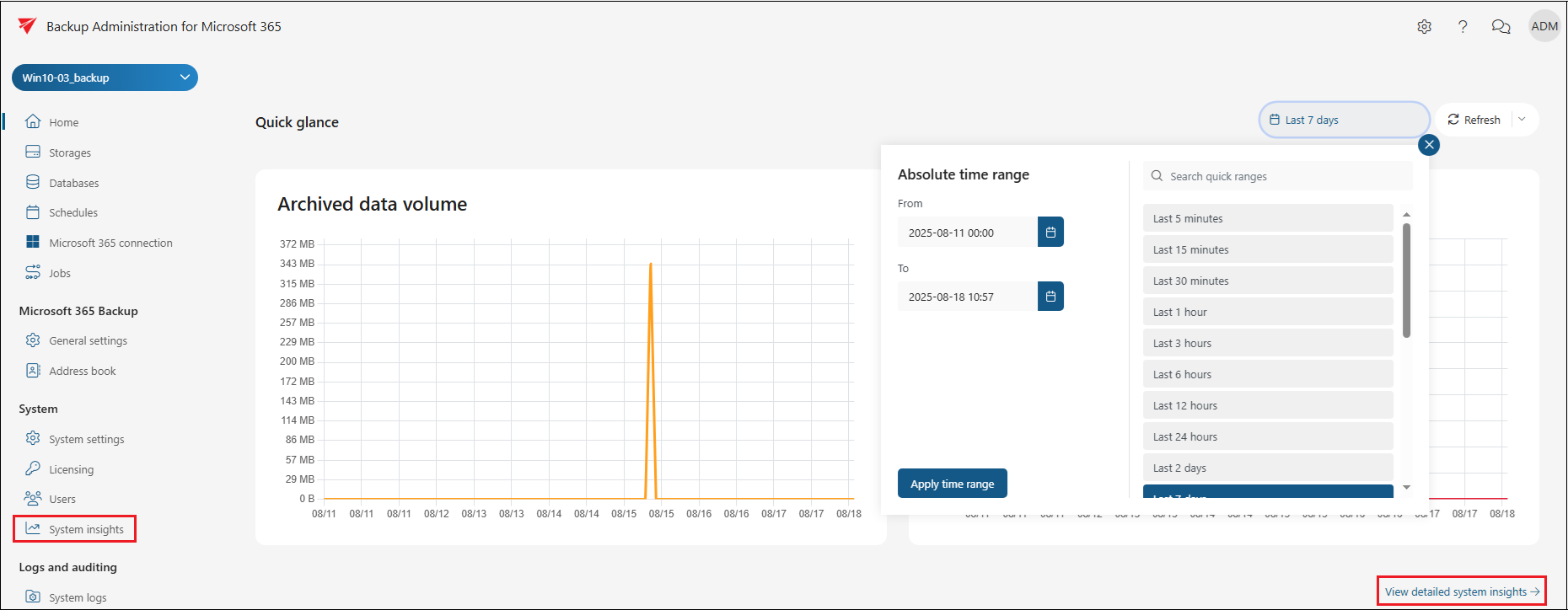 System Insights provides real-time visibility into the performance of your backup and archiving environment. It is built directly into Administration UI and offers clear analytics in all key areas, helping you troubleshooting faster, use your resources more efficiently, and making informed decisions.