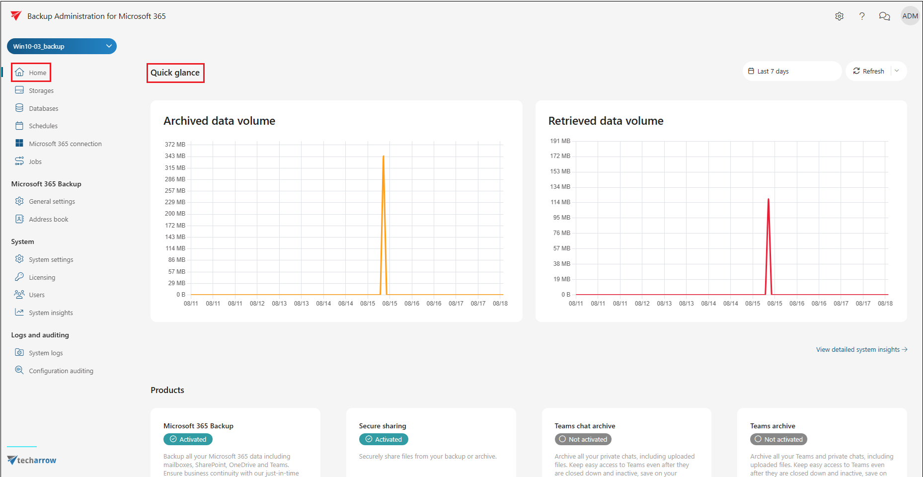 When System Insights is available, the Home page of the Backup Administration displays a Quick glance panel that shows analytics for archived, backed up or retrieved data volumes from the last 24 hours.