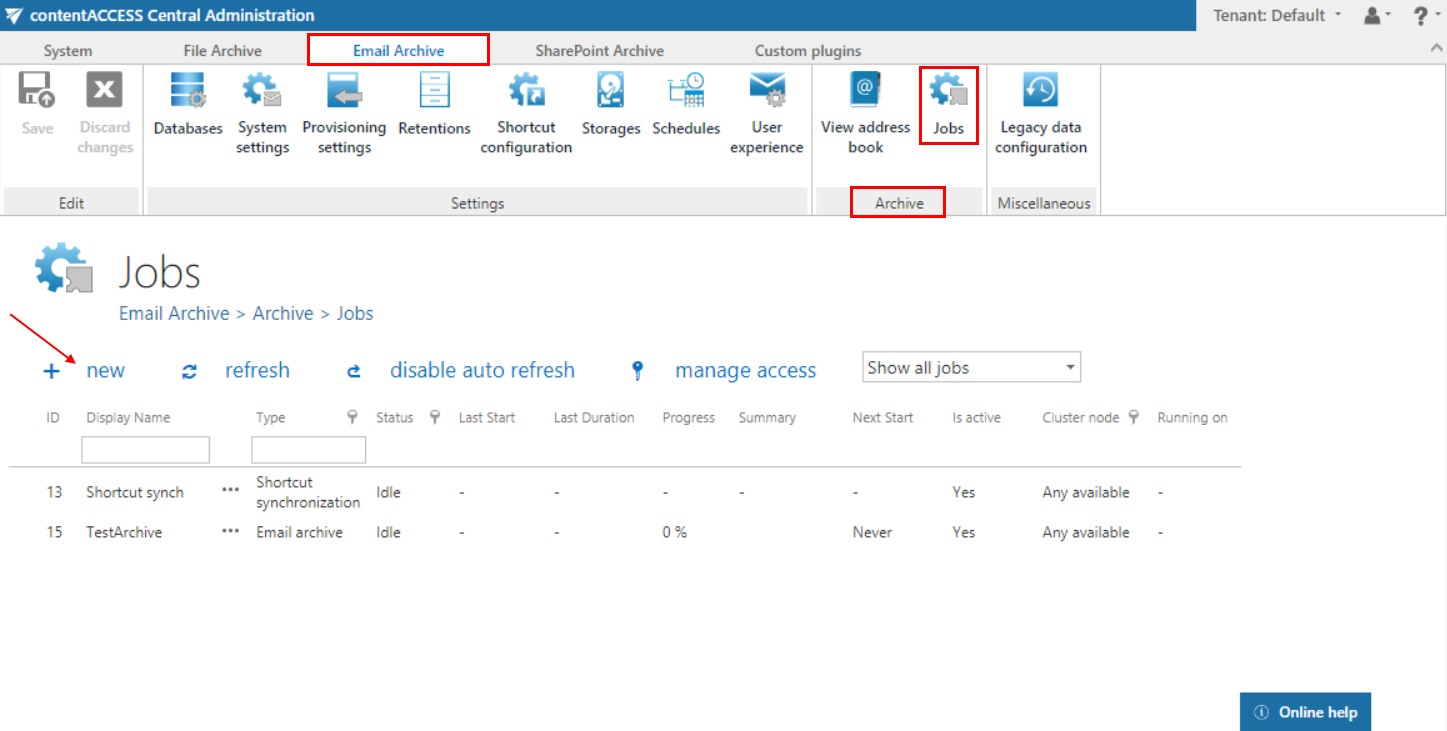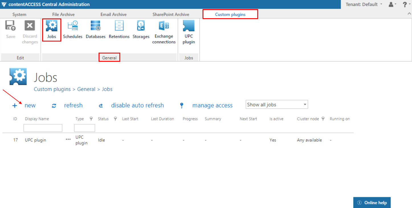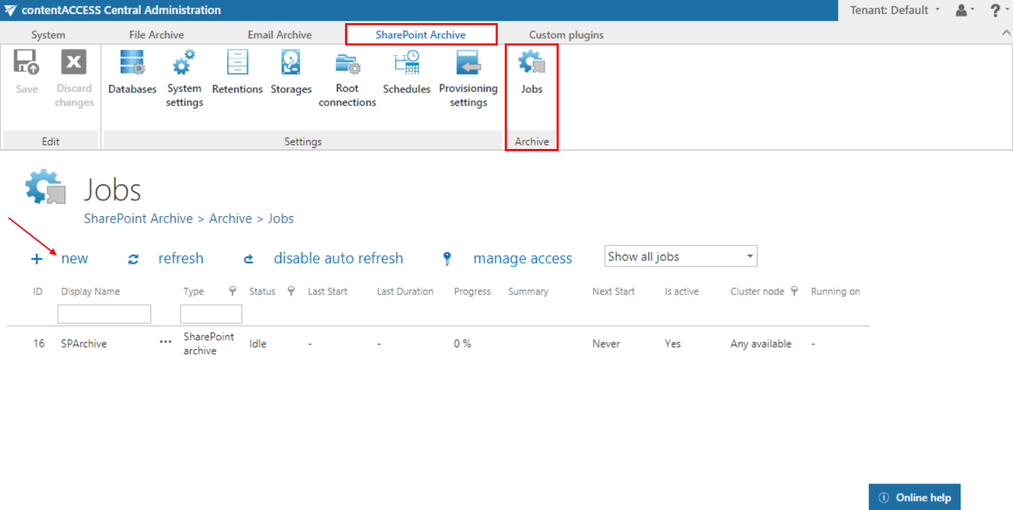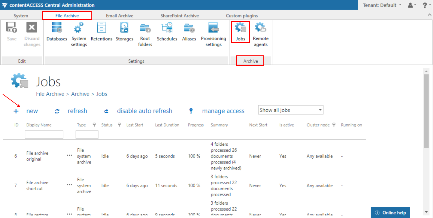 Note: The "+ new" option (i.e. to create new job) is unavailable for the logged on user if the “Add jobs” permission on the tenant is not allowed in his role assignment.