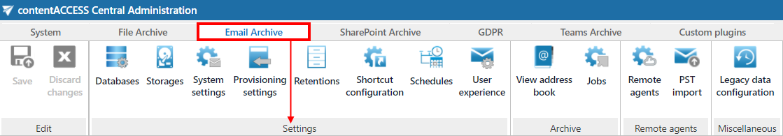 The mandatory email archive settings can be done directly from Email archive tab ⇒ Settings group (Screenshot A).