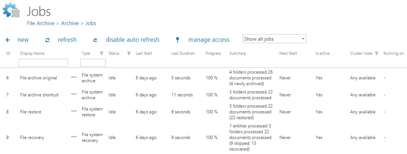 Next columns hold certain information about the Last start, Last duration and Next start of the job. The Progress column informs about the volume of the already processed items, while Summary gives a general overview about the processed/skipped/failed items. In Is active column it is possible to see if a job is active or if it is has been deactivated. Active jobs will run based on the schedule; the data that they are processing are accessible. Inactive (deactivated) jobs are not running (nor can be manually started); the data that they have processed are still accessible. In the Cluster node column we can check the node, where the selected job can run. The Running on column informs the user about the node, where the job is currently running. On the screenshot above we can see that EBA's mailbox archive_shortcutting job can be run on any available node, and is currently running on TANEWS.