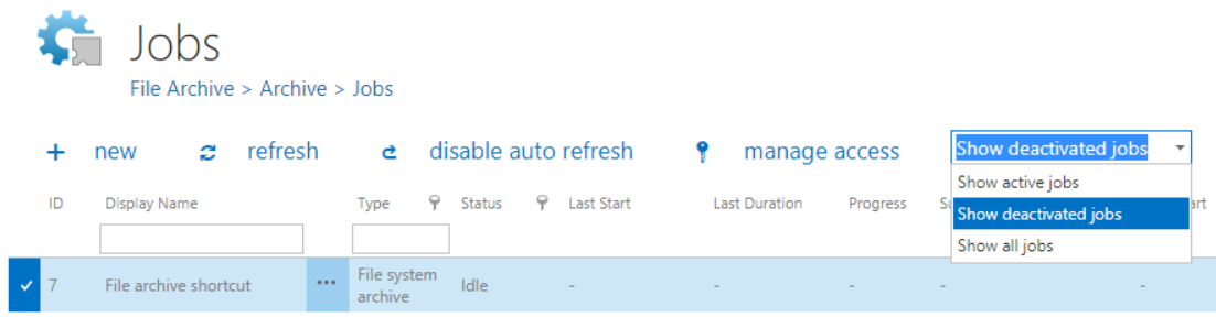 Deactivate: it is recommended to deactivate jobs which are not in use for a longer time, but very probably will be used in the future (e.g. restore or recovery jobs). By selecting this option, the administrator does not permanently delete the job from the list. The deactivated job will be only hidden and it will not run according to the schedule (nor can be manually started). Running and waiting jobs cannot be deactivated.