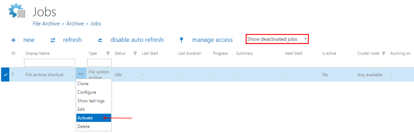 If a job has been deactivated, it can be restored to the list of active jobs again. Select the job, open its context menu and choose Activate from the list: