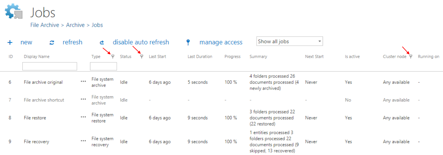 The jobs can be also sorted based on the type, status or cluster nodes where they are running. Click on the funnel (