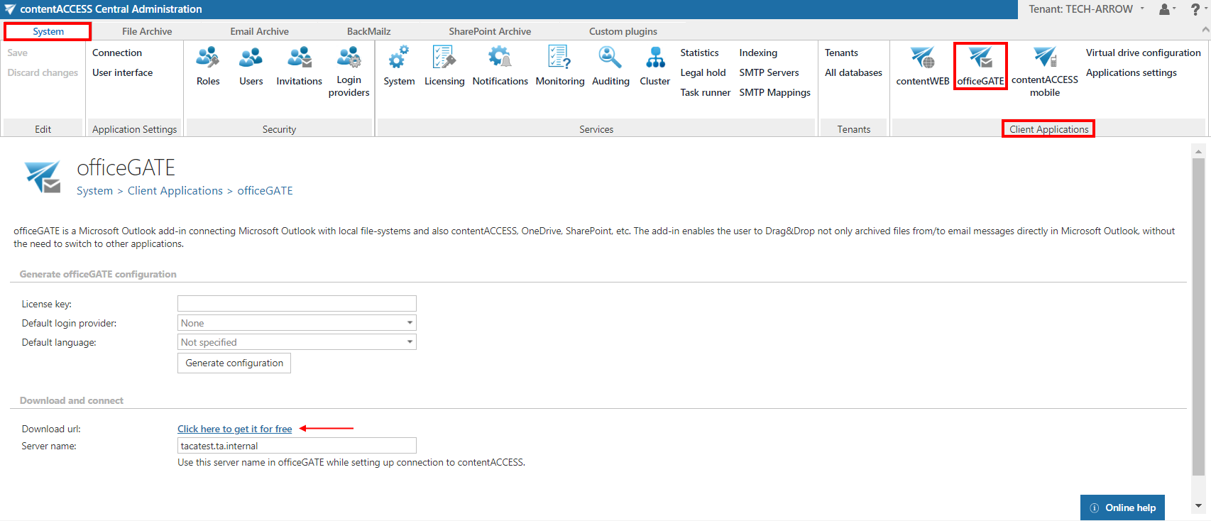 officeGATE can be downloaded for free from the respective page of contentACCESS Central Administration. Navigate to System ⇒ Client applications ⇒ officeGATE button on the ribbon and download a free version of officeGATE from the link.