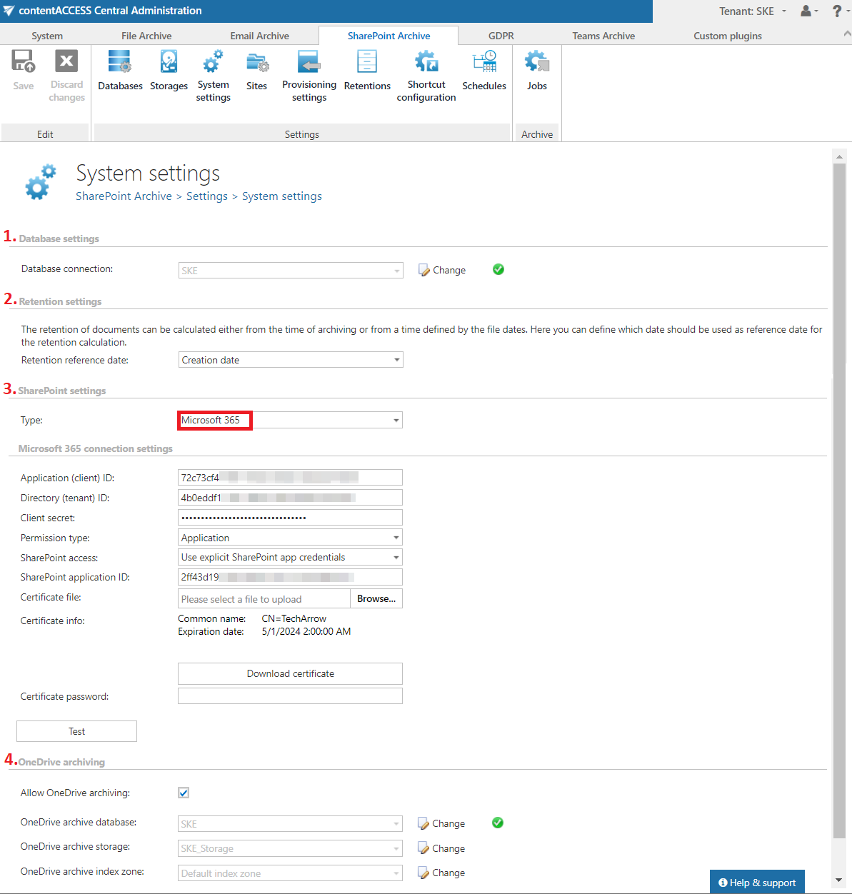 Important: Please note, that the OneDrive archiving section is only visible if Microsoft 365 SharePoint type is selected on the System settings page! In On-premise mode, the OneDrive archiving is not allowed.
