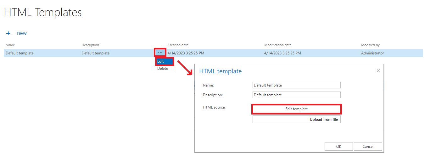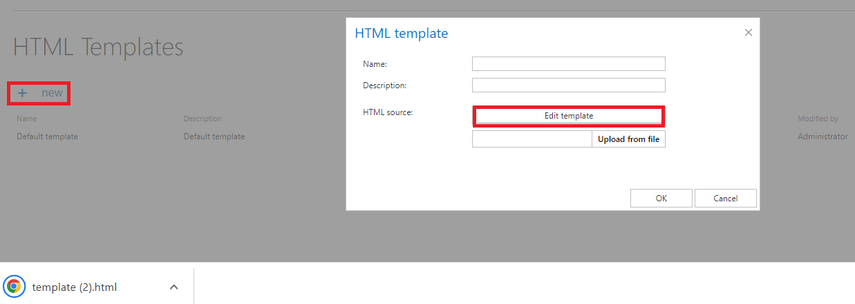 After downloading the template, download an HTML editor from the web and edit your template, then save it. The default/edited HTML template can be uploaded to the template list. Under the HTML Templates section click on + new. The HTML template dialog will open. Here, give a Name for the HTML and fill in the Description field (not required), then click on Upload from the file and browse for the desired template that you have created. Upload it to the template list.