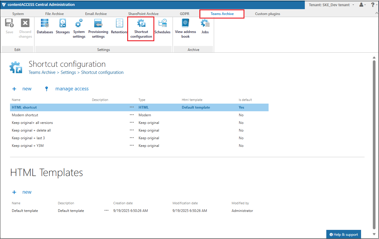 Once your desired template is uploaded, a custom HTML shortcut can be configured. Navigate to Teams archive -> Settings -> Shortcut configuration and click on + new under the Shortcut configuration section. The Shortcut configuration dialog opens. Enter a name for the shortcut into the Name field. In the Use HTML template dropdown list select the HTML template that you have created.