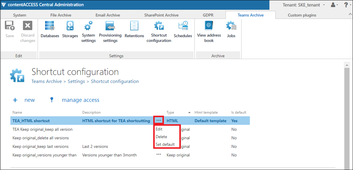 Shortcut configuration in Teams archive