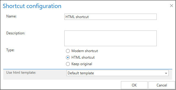 To modify shortcut settings, click on Edit and change the settings in the Shortcut configuration dialog so that the shortcut contains the information that you require. You can also set the selected shortcut as default from the shortcut’s context menu, or you can delete the selected shortcut.