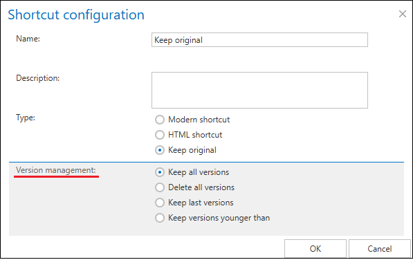In this case, it is also possible to define the version management option: