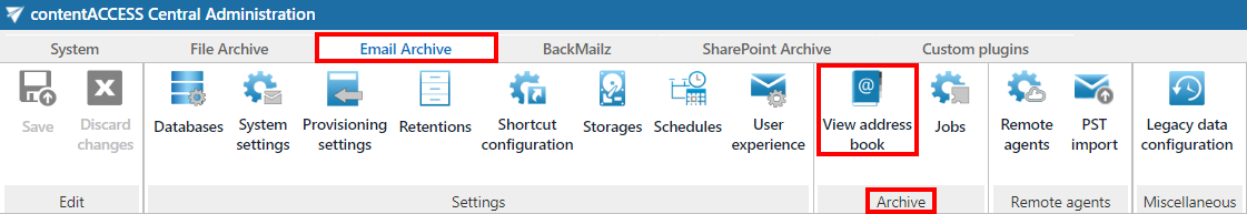 To allow the MailApp activation, navigate to Email Archive ⇒ Archive ⇒ View address book on the ribbon.