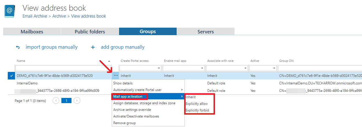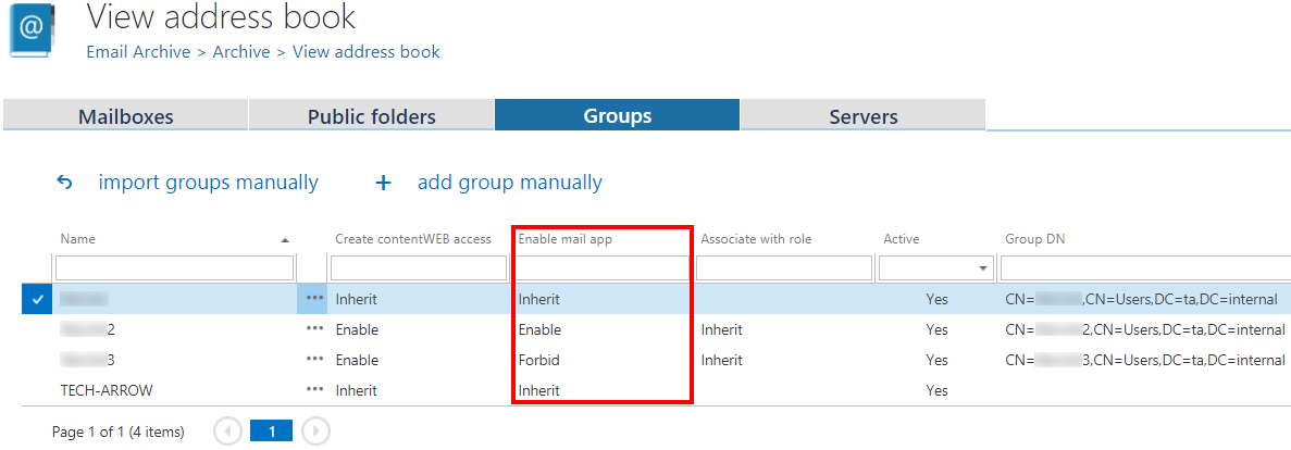In the column Enable mail app it is possible to see if the MailApp activation was allowed for the selected object (mailbox, group or server). By default, the objects inherit the MailApp activation from their parent, so if the parent has it set to allow/forbid, so will the child.