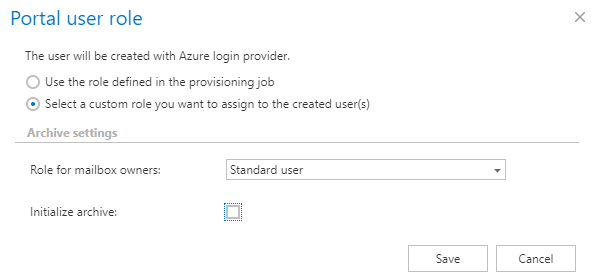 If you selected Explicitly allow, the contentACCESS Portal user role pop-up will open. Here you need to specify the contentACCESS Portal user role (containing user permissions) to be assigned to the contentACCESS Portal user(s). It is possible to select a custom role from the dropdown list or you can use the role defined in the Email archive Provisioning job.