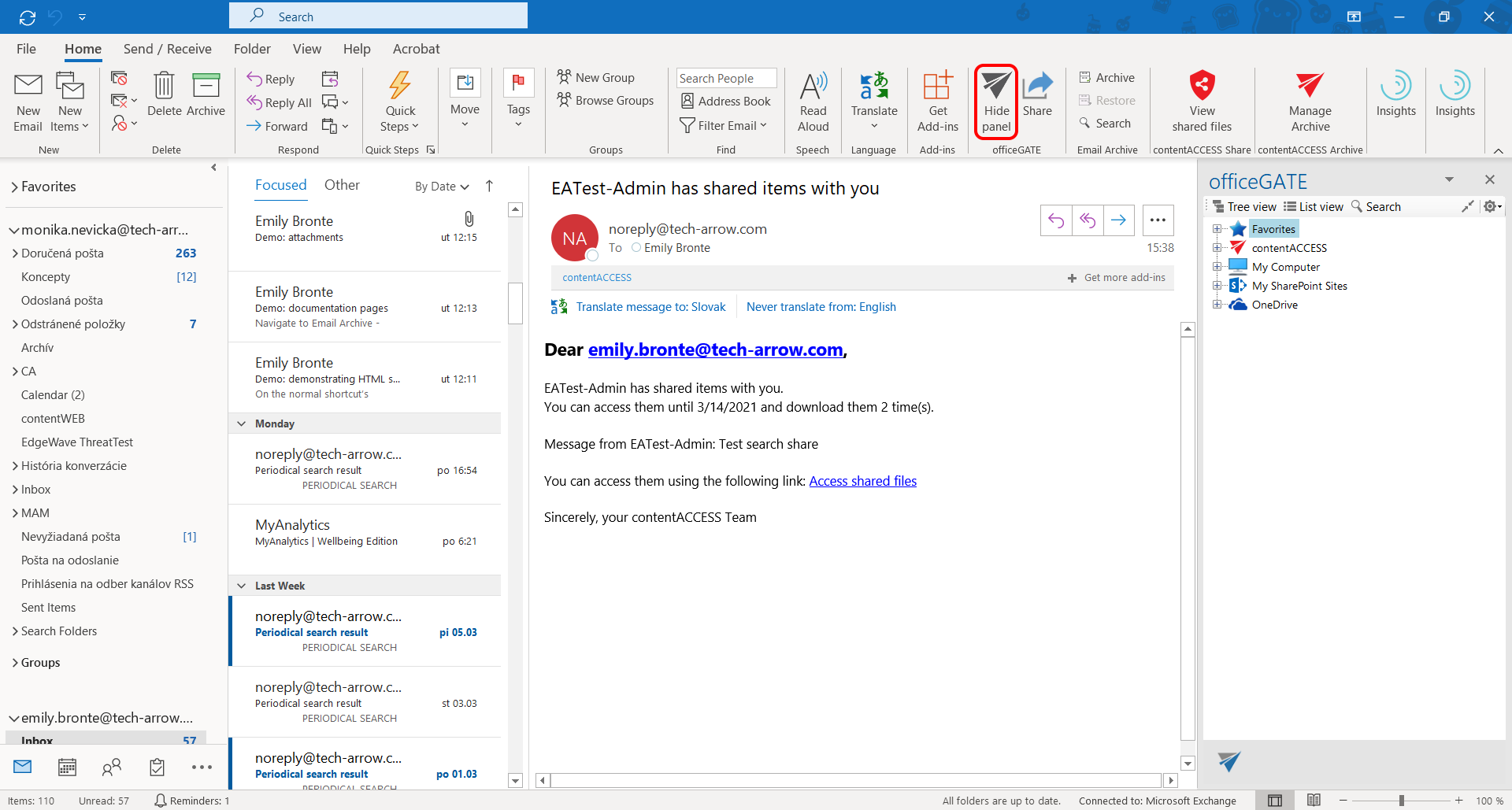 To launch and display officeGATE, open MS Outlook and click on the Show panel / Hide panel (