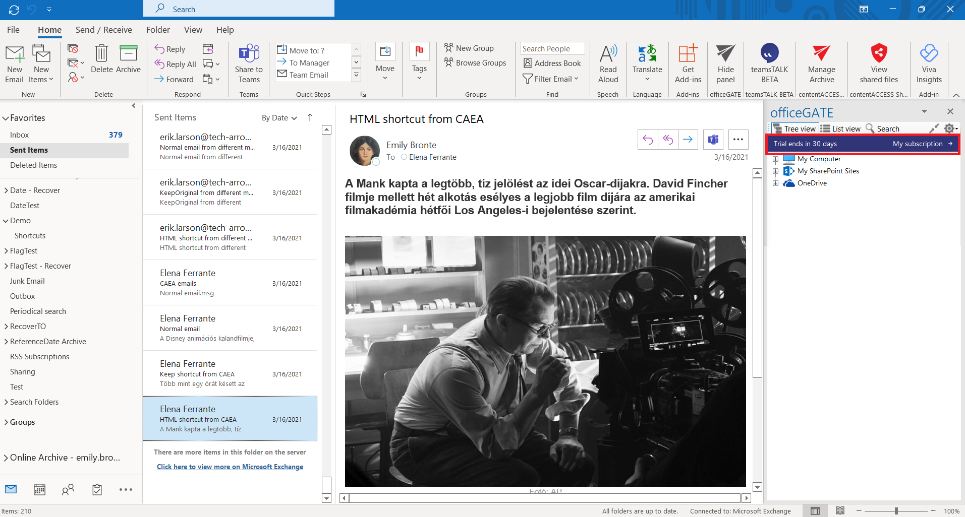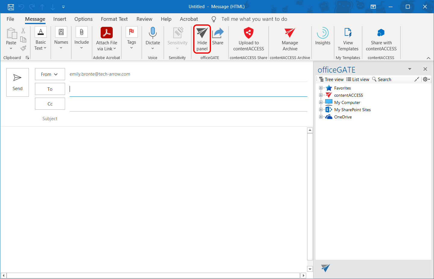 The officeGATE panel can also be accessed in a compose e-mail message window. To show it, click the officeGATE button (
