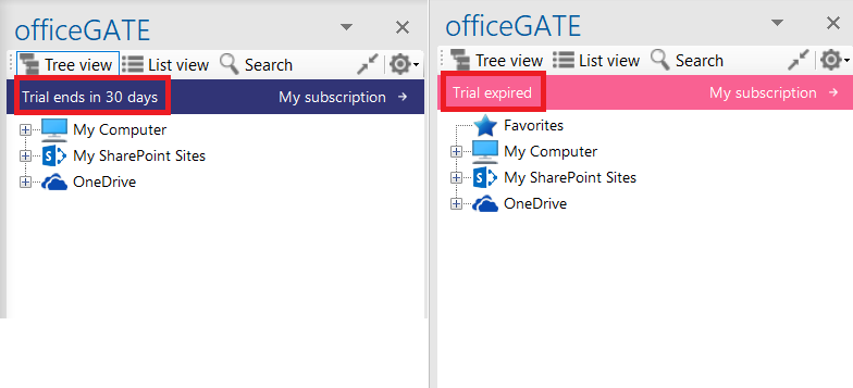If officeGATE is downloaded and installed from the store, then a notification bar is displayed in the pane. The user can follow here when the trial/subscription ends and check their subscription (account, orders, downloads, account details) in the TECH-ARROW store by clicking on the My subscription or the arrow.