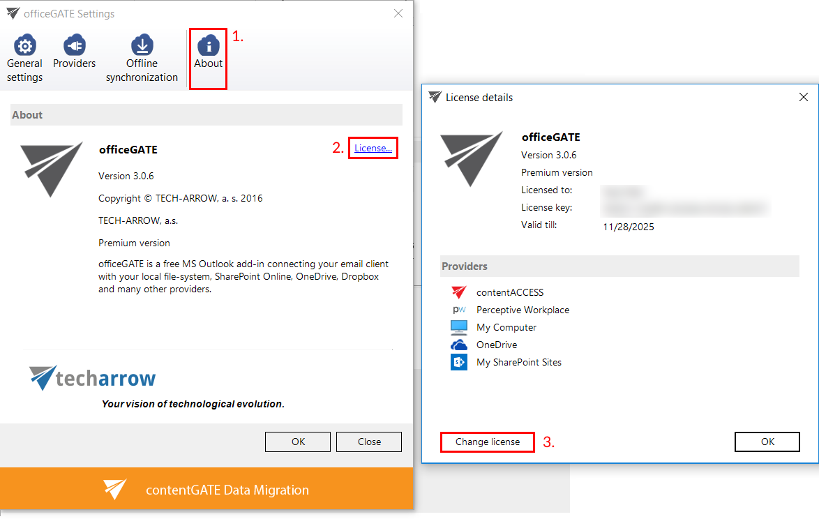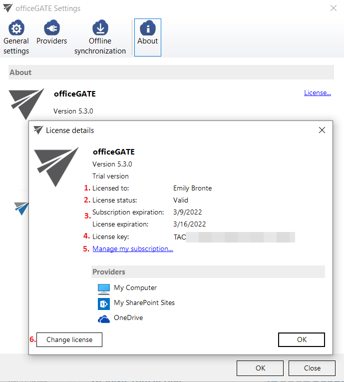 About tab ⇒ License button. In the License details window your actual license details will be shown. If you click Change license option the License Activation Wizard window will open. Here you can activate a new license key for the product. If you previously used a free version of officeGATE and now you decided to use Premium version then you need to activate the new license key right here.