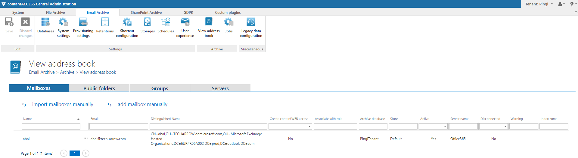 ✓ Manual server, group, and mailbox creation in address book: The address book now allows manual creation of servers, groups, and mailboxes directly from the address book. This feature is useful for migration and SMTP archiving use cases where the target mailbox does not exist on the Exchange server or could not be imported by the automated provisioning process.