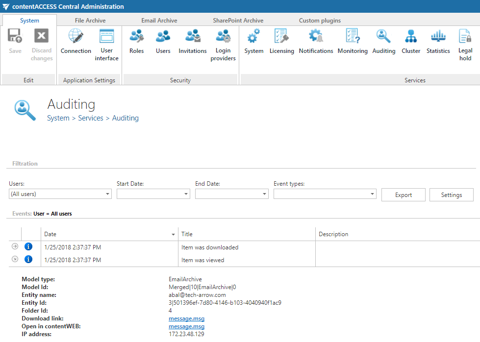 ✓ Auditing user IP: User access auditing has been extended with the IP address from which the given user was connected during an operation. The user’s IP address is dynamically updated inside contentACCESS in case of change.
