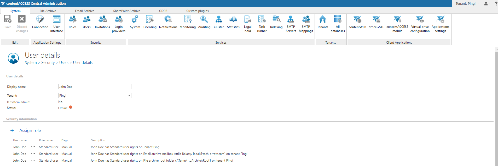 ✓ Roles on user details: The user details page has been improved to allow role assignment directly from it. Role descriptions have also been extended to include the display name of the object (email address, file archive root, …) to which the given role was assigned.