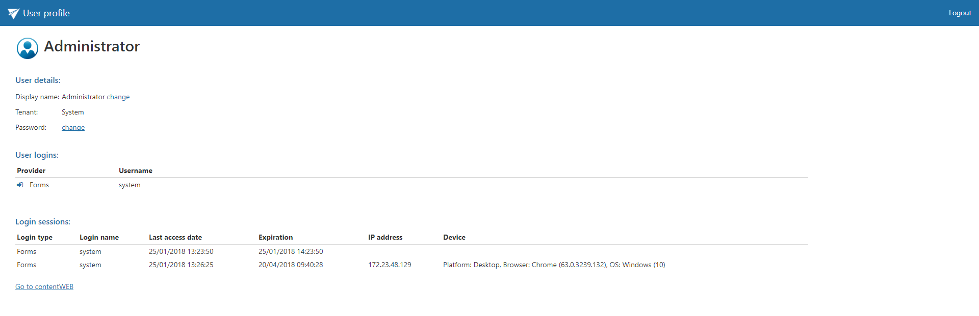 ✓ User profile: The new user profile page allows the currently logged-in user to see their user details, login types, and active login sessions. Users can also change their contentACCESS password or display name, which is visible inside contentACCESS. The profile page is directly accessible for end users from contentWEB.