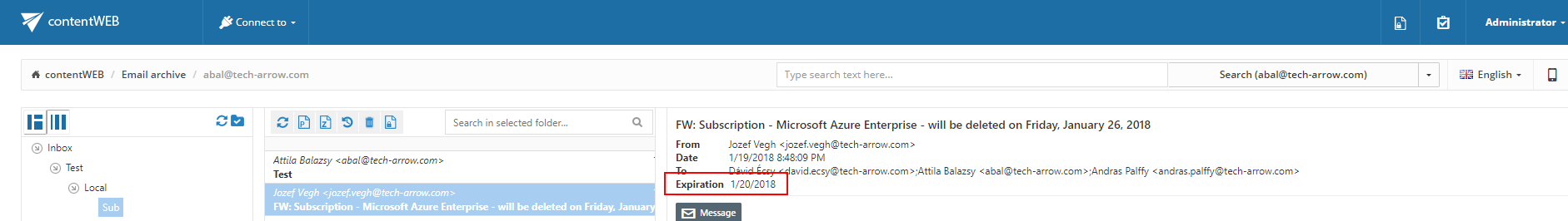 ✓ Retention expiration displayed in contentWEB: In this new version, contentWEB displays document expiration based on the associated retention settings. Retention is visible in all modules that support it, including file, email, and SharePoint archives.