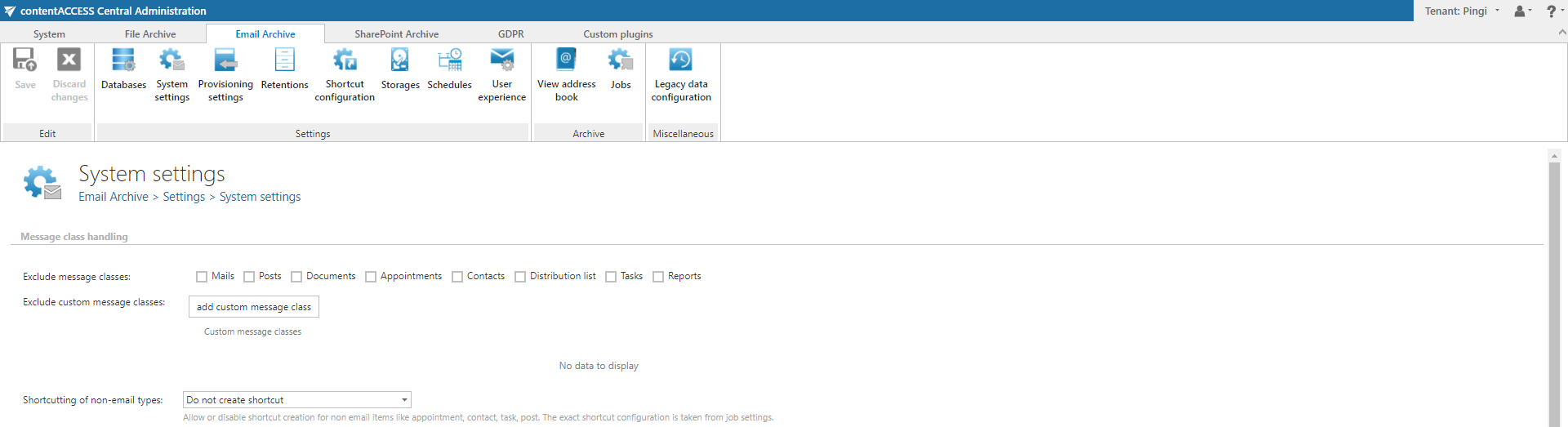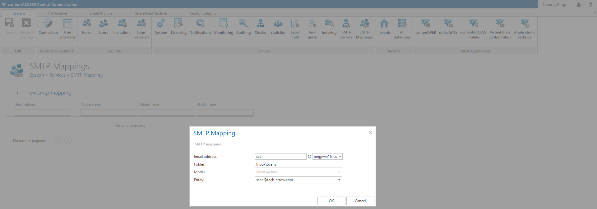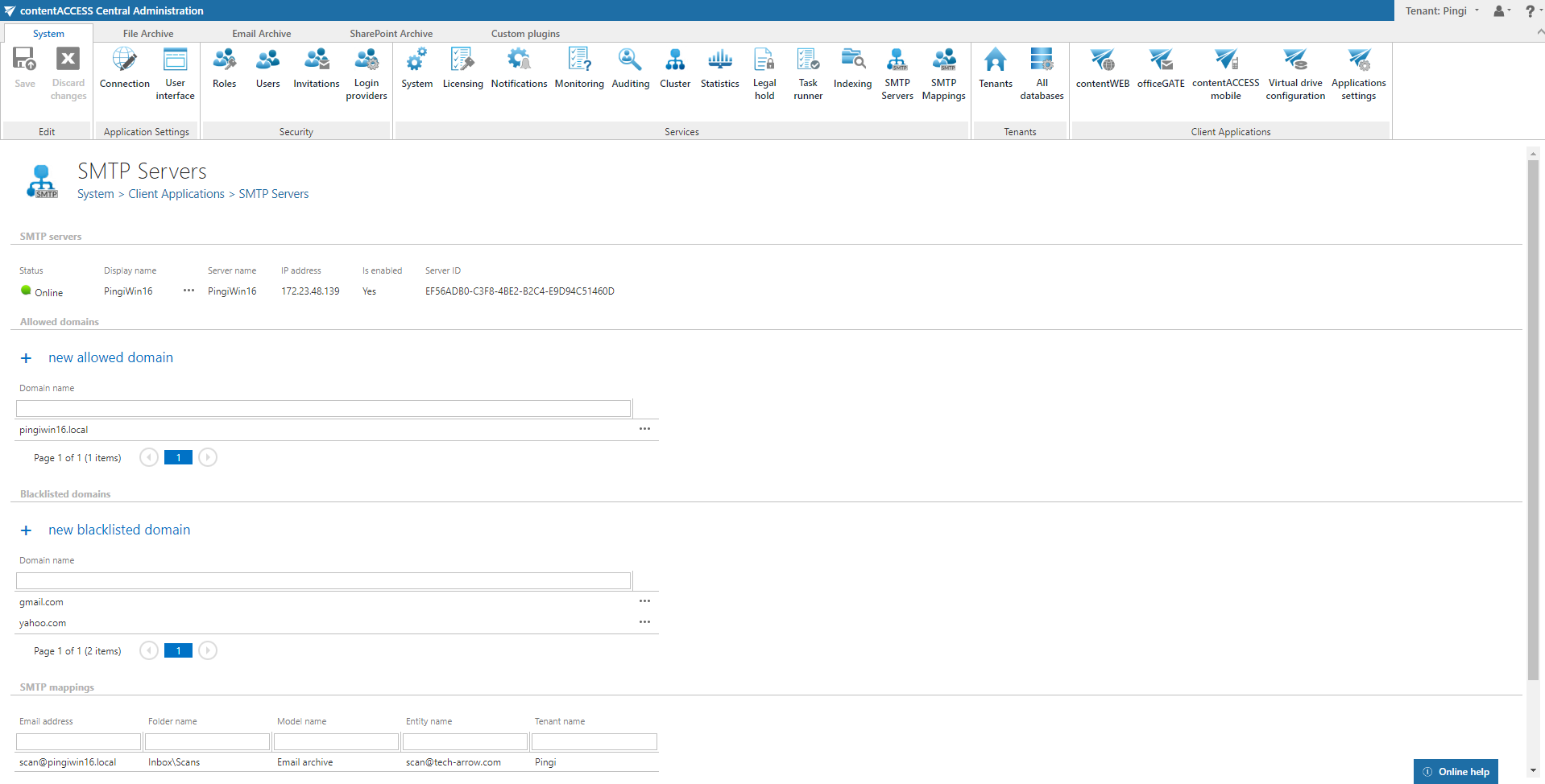 ✓ SMTP server configuration integrated into Central Administration: The new version comes with integrated management of the SMTP server component, allowing system administrators to manage multiple SMTP servers connected to contentACCESS directly from Central Administration. Tenant administrators can also configure their virtual mailbox mappings from Central Administration without requiring system administrator interaction. This makes it easy to define a virtual email address and mailbox that will archive incoming emails directly into contentACCESS.