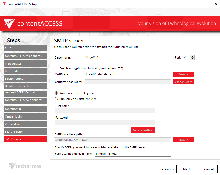 ✓ SMTP server integrated into installation package: Installing and configuring the contentACCESS SMTP server is now easier than ever. It is now part of the standard component list in the installation package, allowing full configuration options, such as certificates, data paths, and domain names, with a single click.