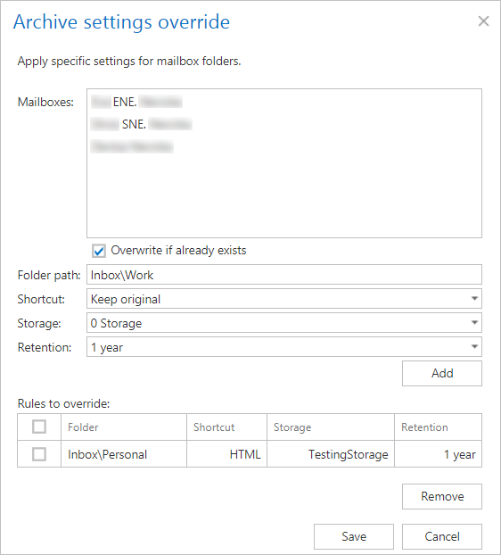 ✓ Override option: Do you have specific mailboxes with folders that require different configuration settings, such as storage, retention, or shortcutting type? With this new feature, you can now override settings at the folder level.