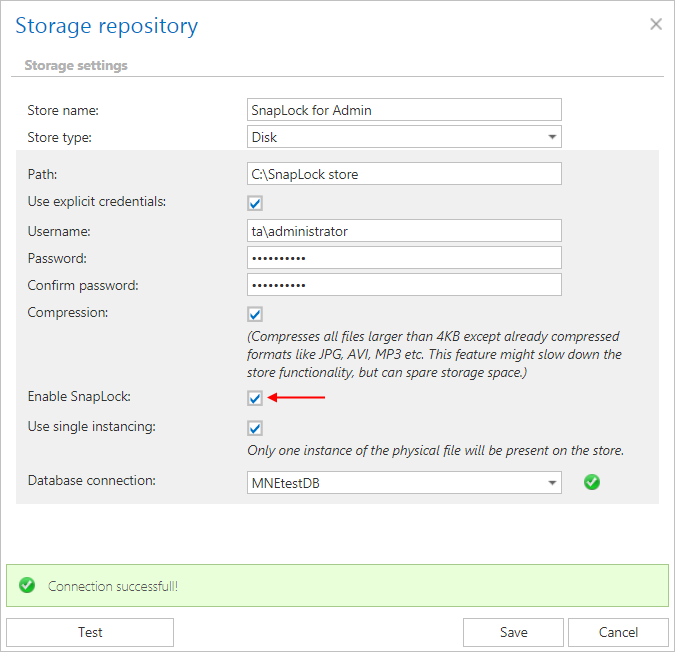 ✓ SnapLock support in DiskStore: The Disk store now supports SnapLock, which allows the storage system to prevent file deletion until the specified retention period has expired. This feature can be used with storage systems that support it, such as NetApp.