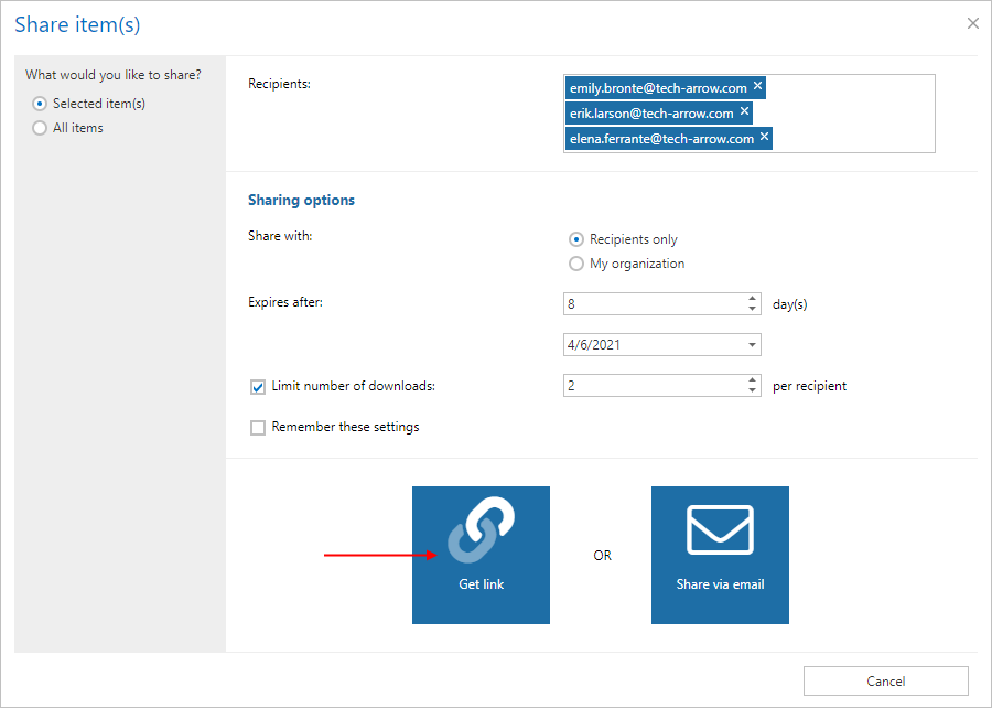 Don’t want to send an email? Simply copy the sharing link and send it via Messenger, Hangouts, Skype, MS Teams, or any other channel you prefer.