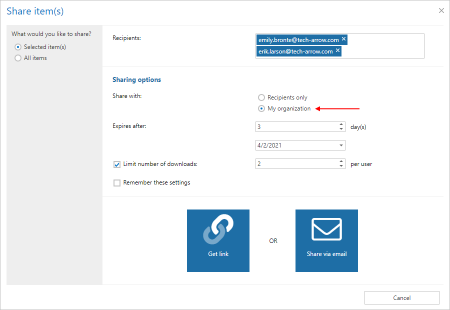 Are you sharing files with multiple people from your organization? Not sure who exactly will access the file? No worries—just select “My organization” as the audience, and contentACCESS will ensure that everyone in your organization can access the item, but nobody outside of it.