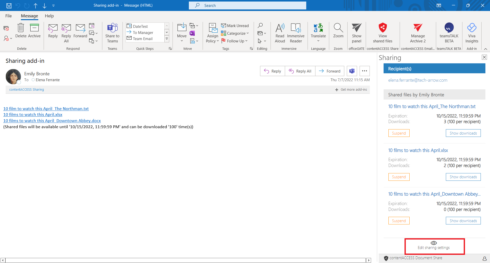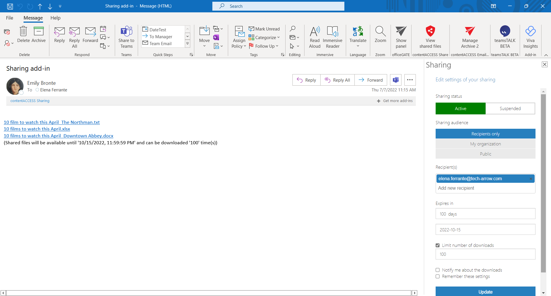 You can get a notification when somebody (from the recipients’ list, from your organization, or anybody else) downloaded the shared items. The notification email will contain the following information: who downloaded which item, when, and how many times.