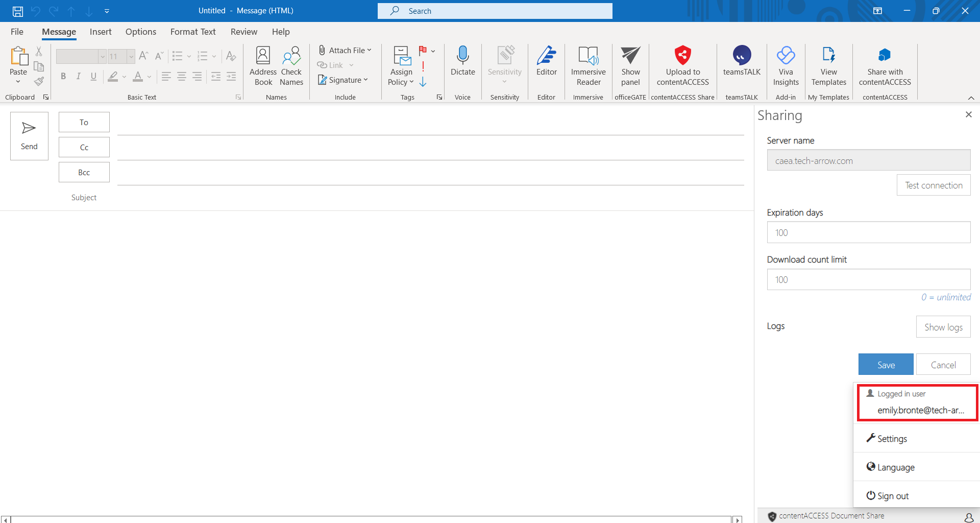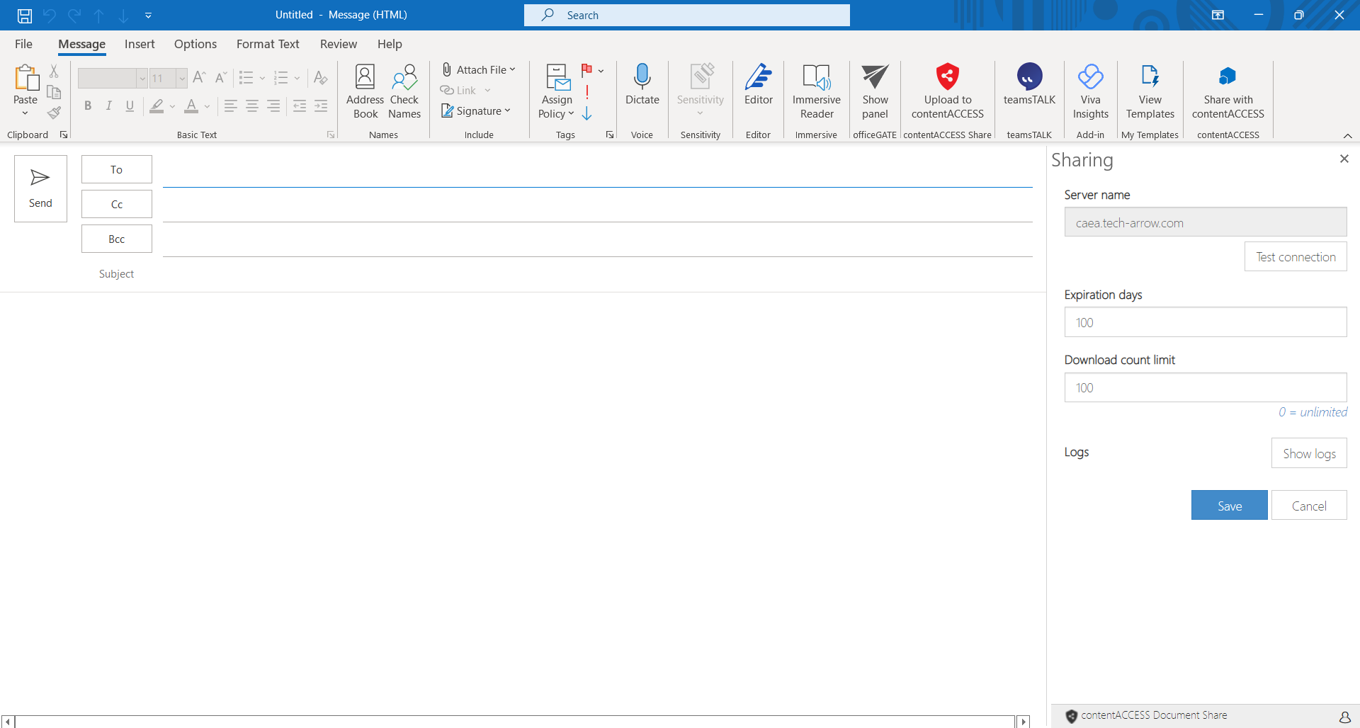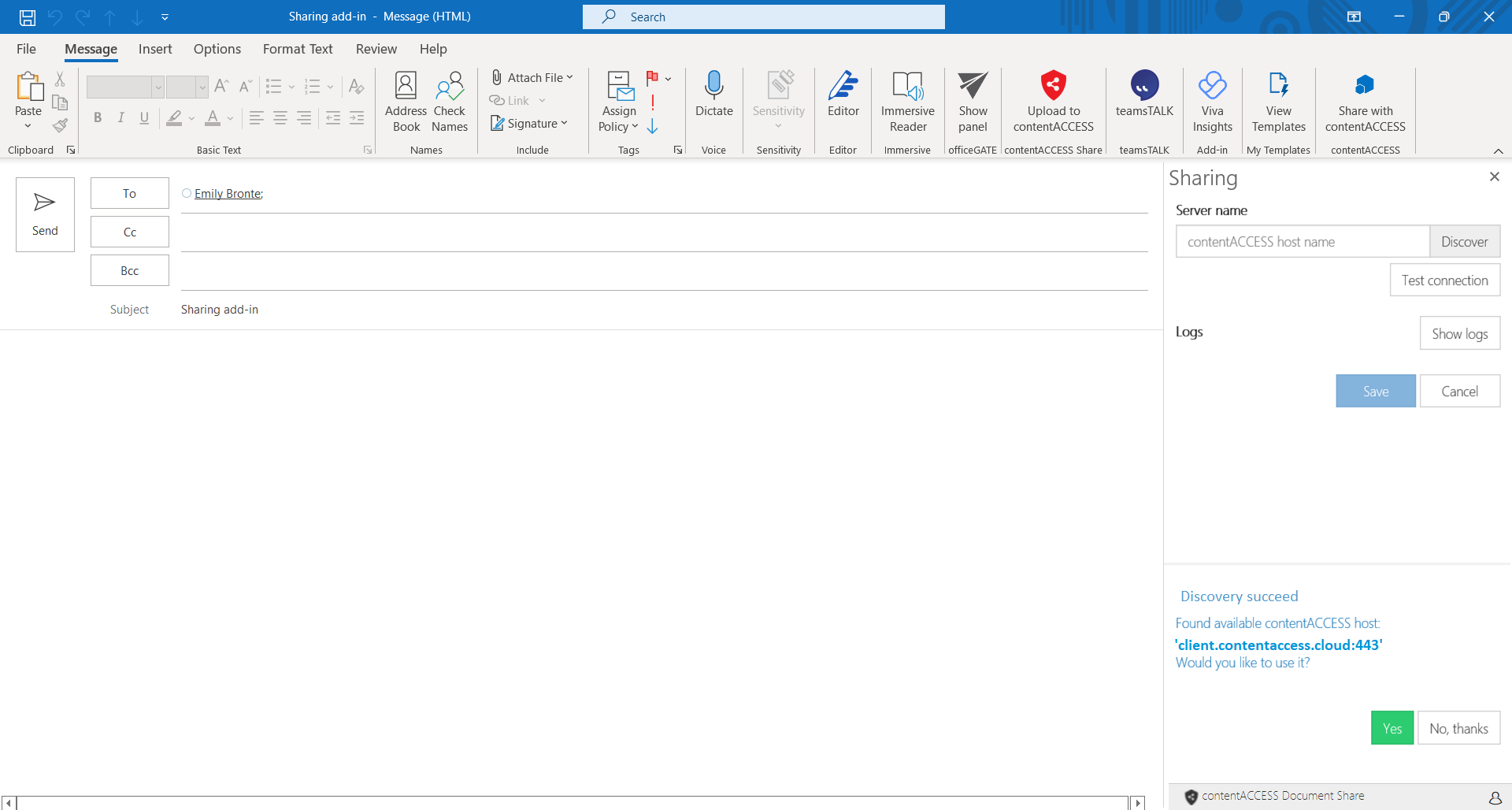 - If Office loads the add-in UI and it is the first run, the user should see the Get started page. After clicking on the Get started button, the connection page opens. Here the user can define server name (only the host name!), where contentACCESS is running. It is enough to type the host name, no need to type the protocol. If you don't know the exact contentACCESS server host name, you can use the Discover functionality, which will check available contentACCESS servers for you. Logs can be viewed by clicking on the Show logs button.