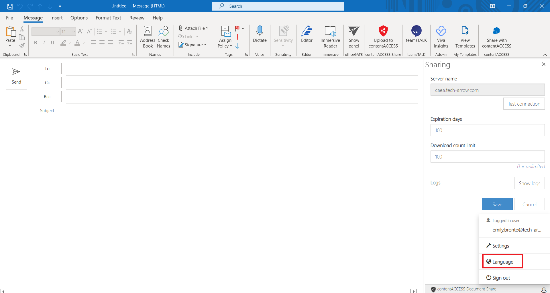 The add-in also supports localization. The add-in also supports localization. Currently, we are supporting Arabic, Czech, Chinese (simplified), Dutch, English, German, Hungarian, Norwegian, Polish, Portuguese and Slovak language. The user can change application’s language on the Language settings page. The change needs to be saved by clicking on the Save button.