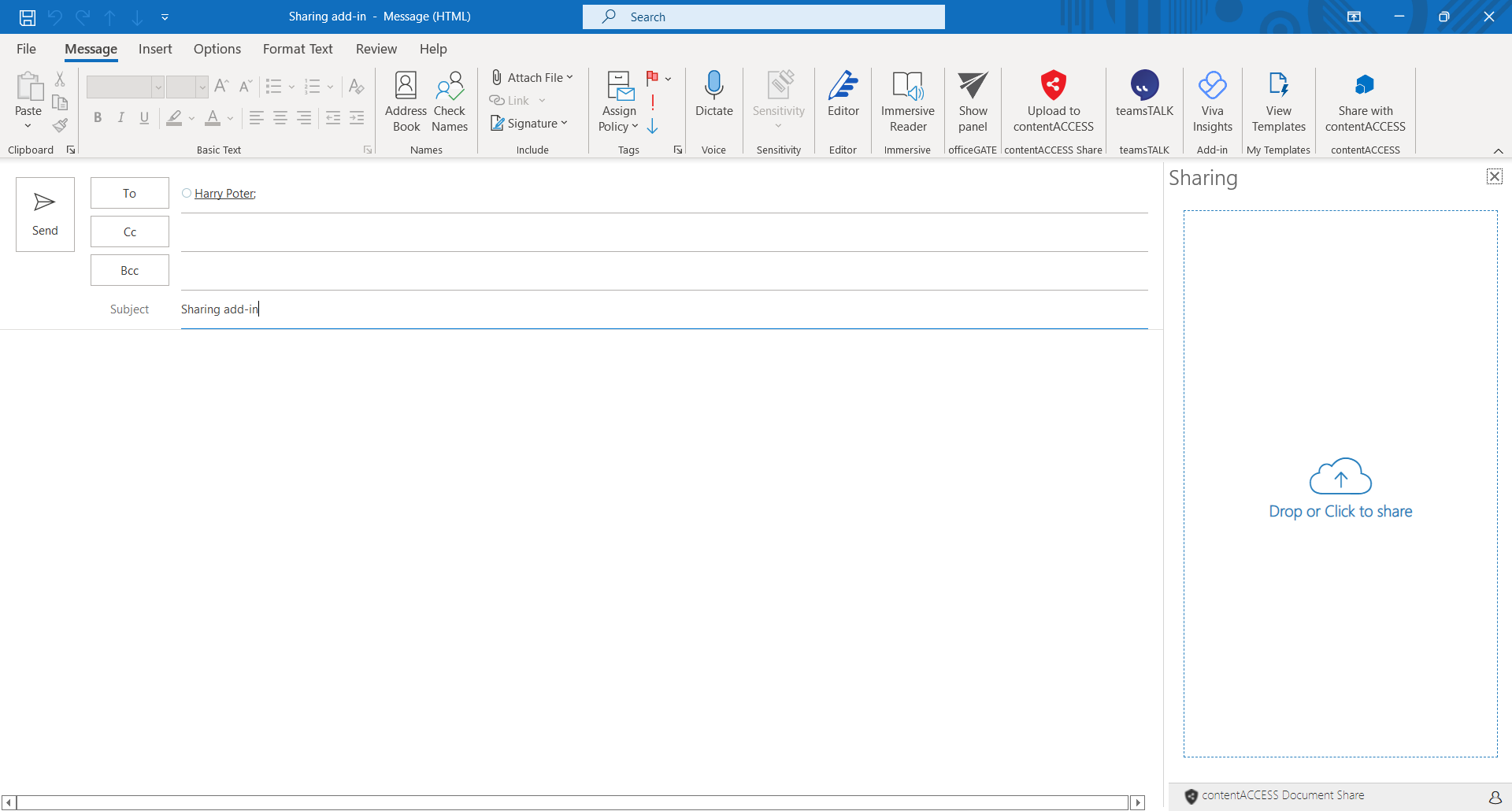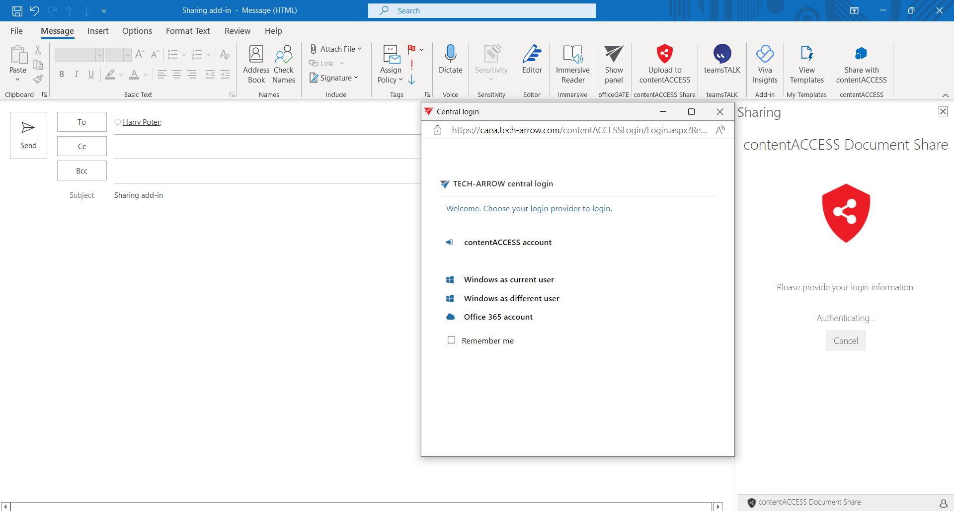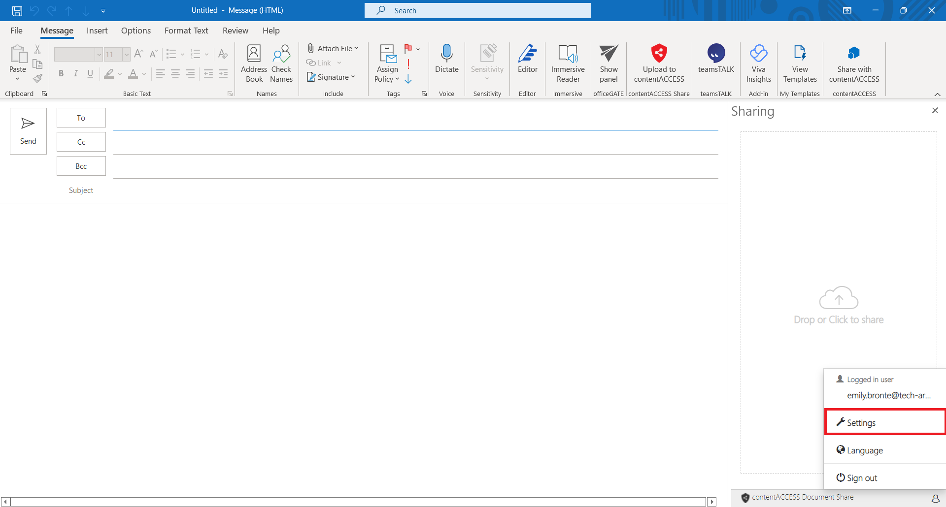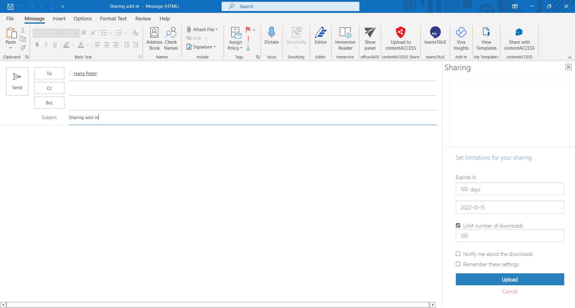 - Choose Upload to contentACCESS (from ribbon or from the list of add-ins, depends on the client application)