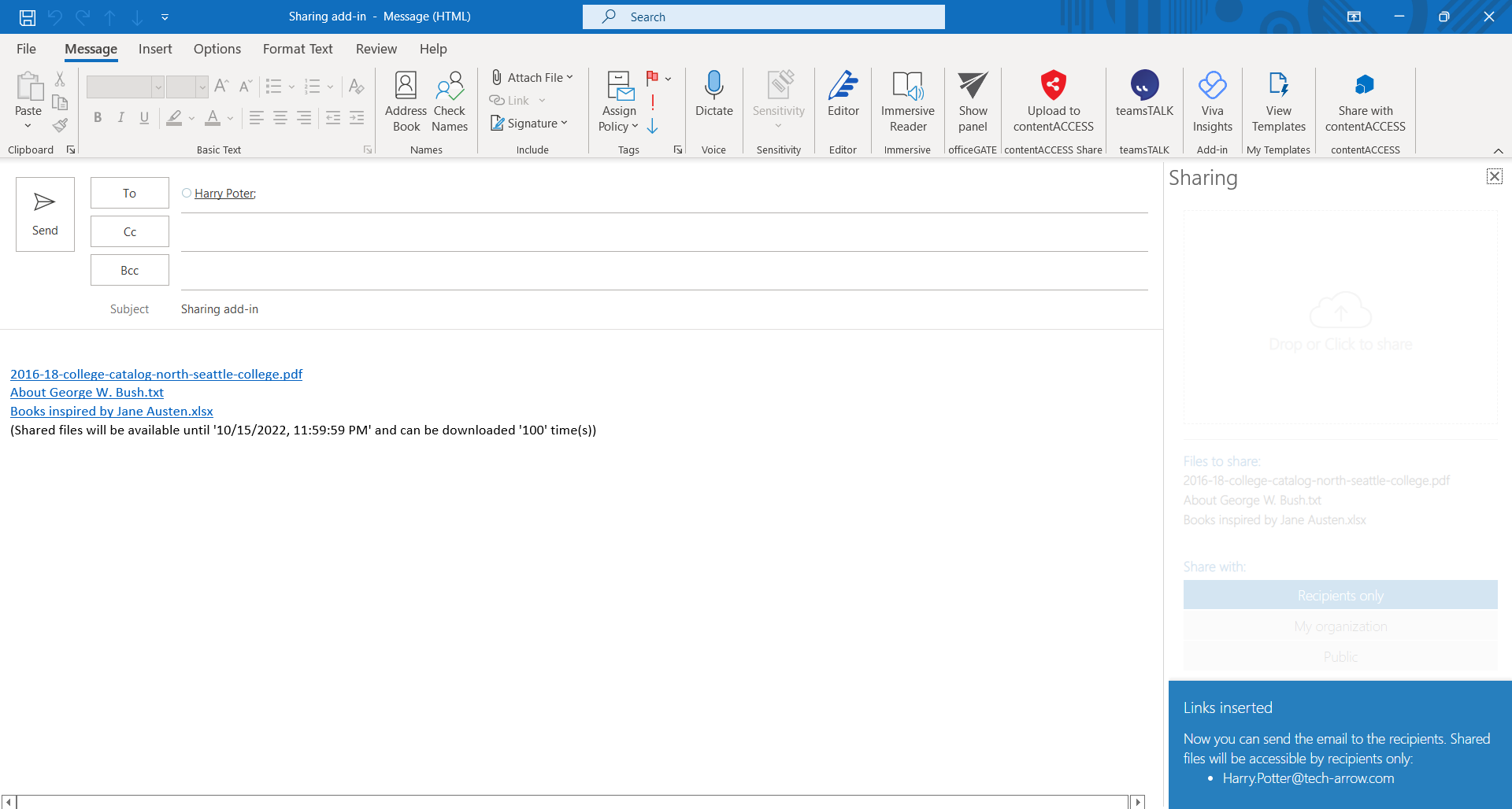 - After the item(s) has been successfully uploaded and recipients were set, the link will be injected into the body of the email. There is a known issue that on mobile devices it is not possible to inject HTML into body. The link (HTML formatted) is displayed as text in the body.