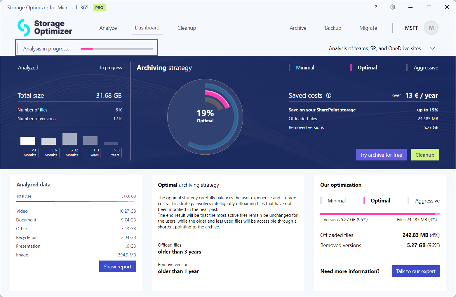 The analysis process can take some time, as it thoroughly scans the entire site and document structures, reading metadata and version history to provide a comprehensive overview. The performance of Storage Optimizer is influenced by several factors, including the structure of your SharePoint environment and the number of users, since SharePoint’s throttling calculations are based on user count. Additionally, the system must account for various factors such as file sizes, types, and the number of items to process, which can further affect the speed of analysis. Although it may seem that the analysis has stopped or is not processing anything, it is actually still running in the background, continuously analyzing sites and items. The process continues to analyze sites and items, updating data as needed. Depending on the scope of your environment, this background process can take time, but it is working to ensure that all information is accurately captured and processed. Please be aware that larger environments will naturally take longer to analyze thoroughly.