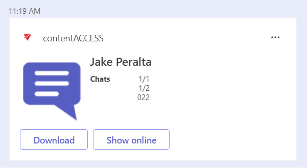 Your chat partner(s) will now be able to download the item you shared with a simple click on the Download button! The download link is pointing to Teams service, so the user that wants to download the file doesn't need to have a contentACCESS account.