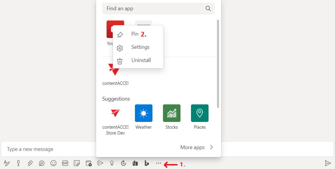 First, we would like to recommend you to pin the contentACCESS app – this will save you a lot of time. Click on the Messaging extensions button (1). Right-click on the contentACCESS icon and click on Pin (2).