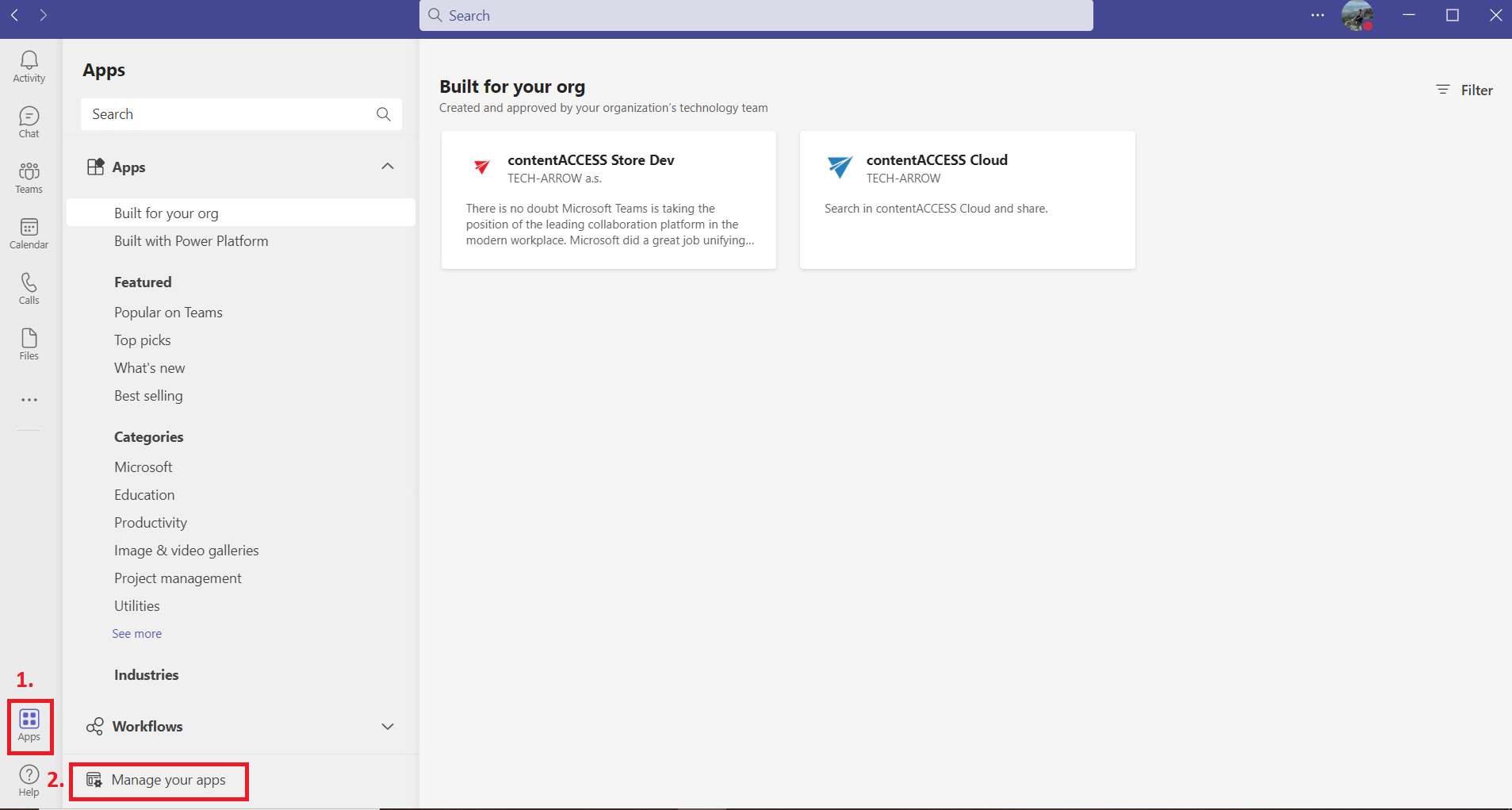 First, open your MS Teams application and navigate to the Apps in the bottom left corner. Then click on the Manage your apps option.
