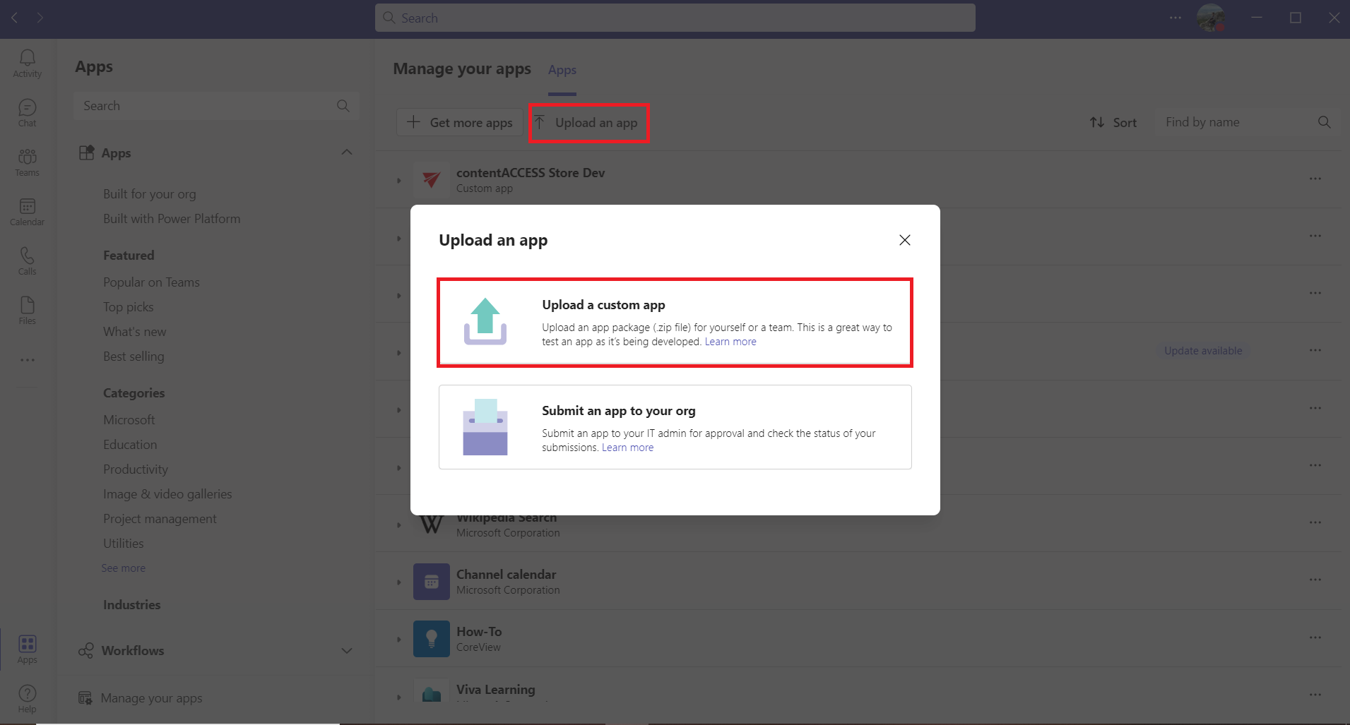 On the Manage your apps page click on the Upload an app button and select Upload a custom app from the available options.