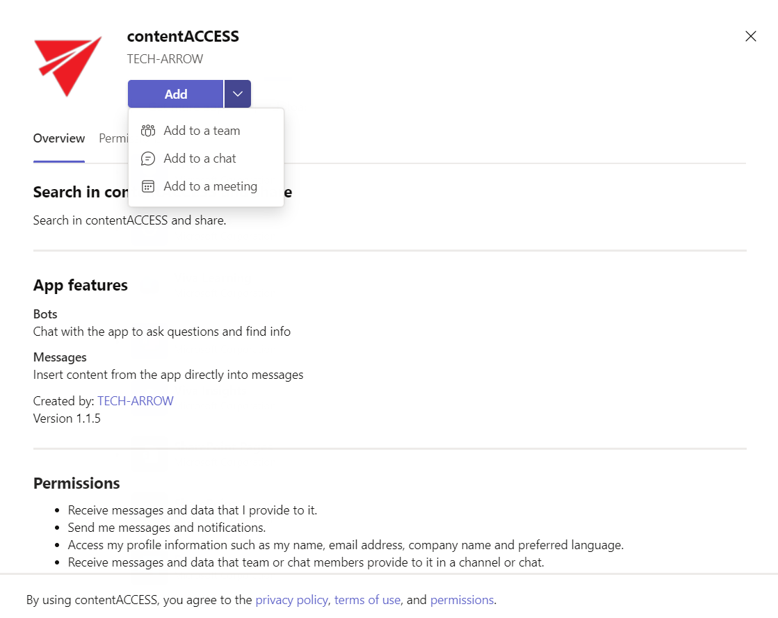 - Add – adds the app to all chats and teams just for the user – this option is recommended