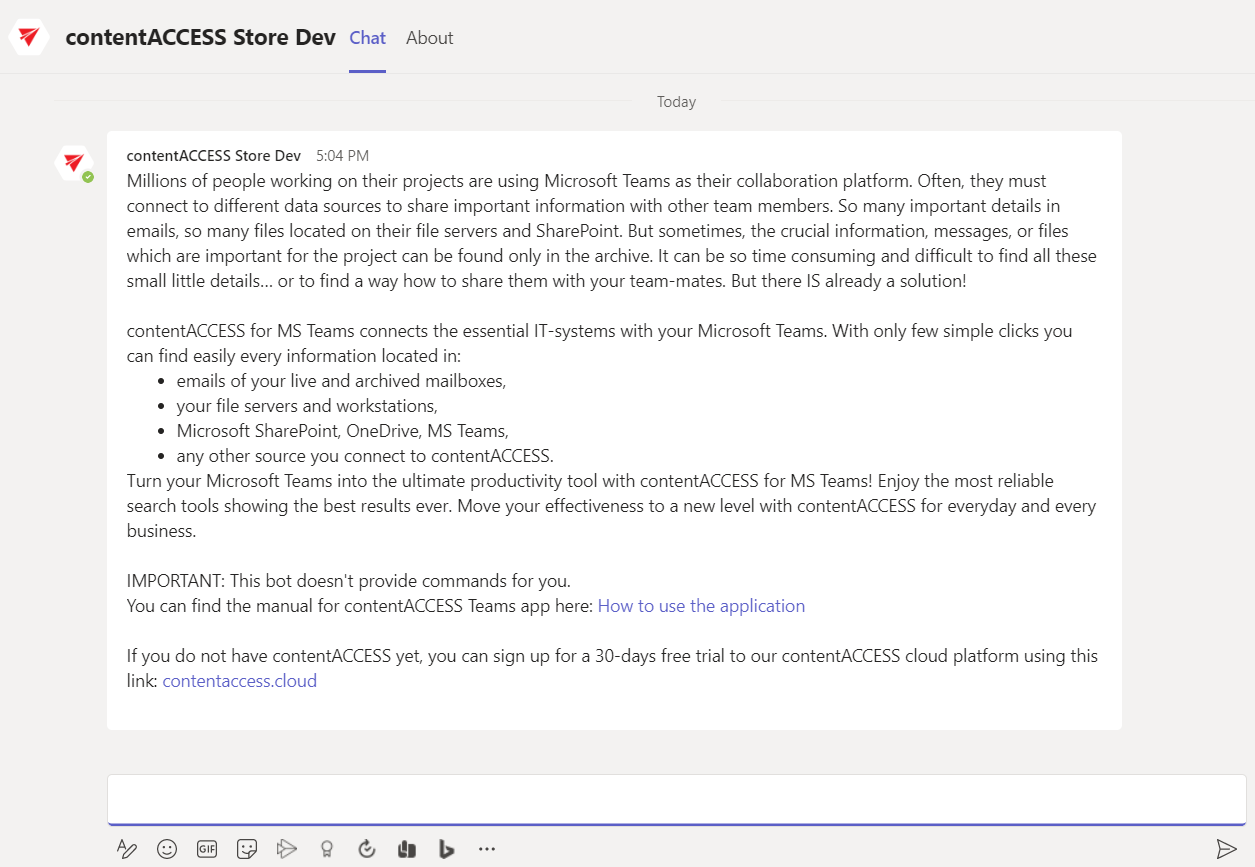 The chat with the contentACCESS bot will be opened. This bot forwards the calls to the Teams service. You can switch to your desired chat now.