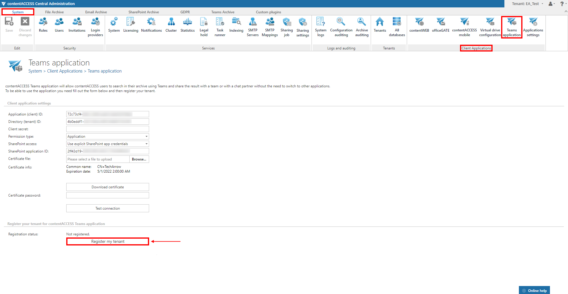Application ID and Directory ID are automatically generated during the App registration on Azure portal, Client secret can be manually generated in section Certificates & secrets after the application is registered. (Teams archive registration is described in this section of the contentACCESS manual.)