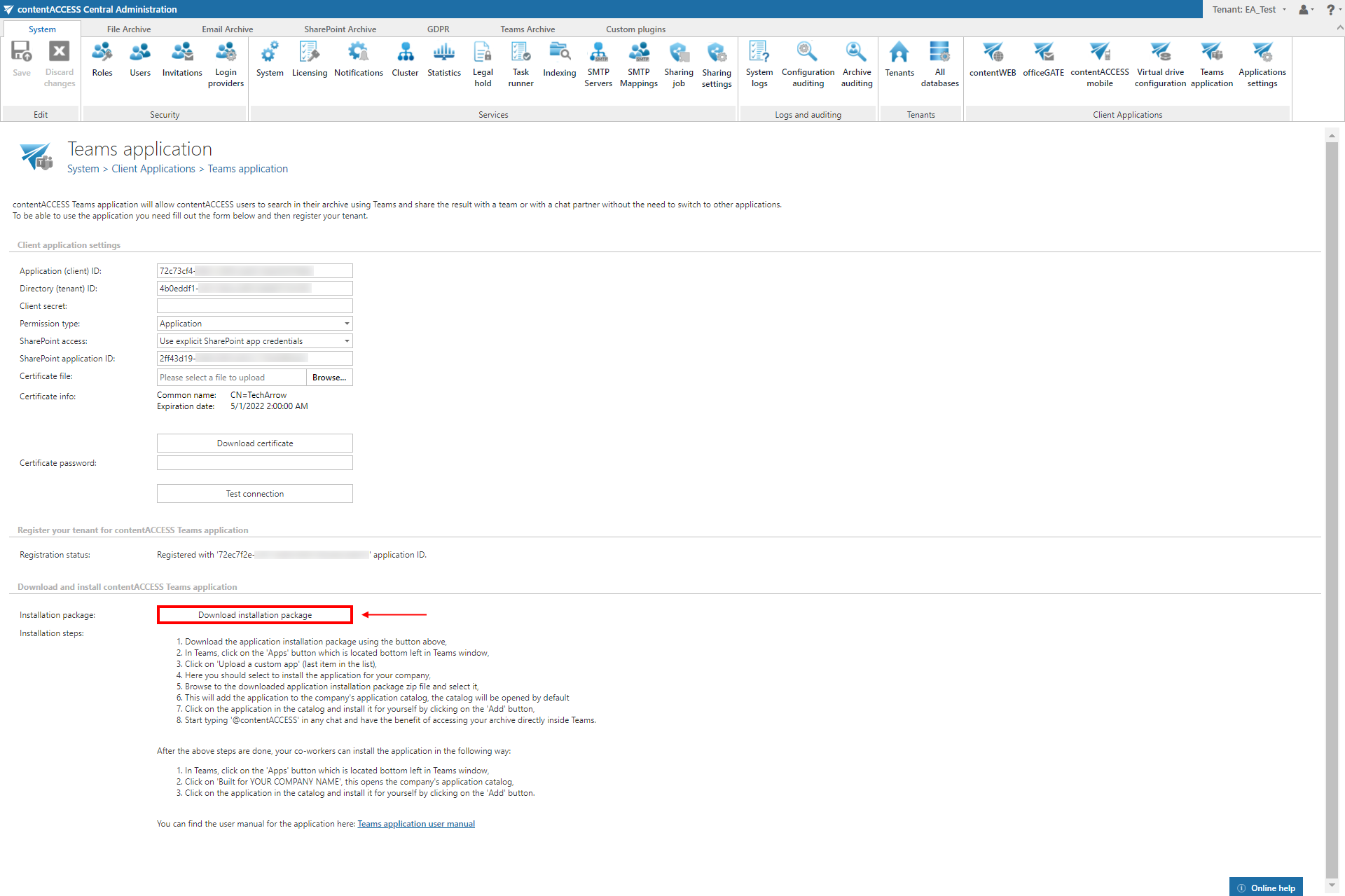 Fill in the Client application settings. These are used to query the members of a chat/group/Teams channel when sharing in MS Teams using the contentACCESS Teams application.