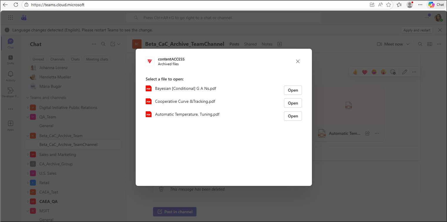 Upon clicking on the option, a contentACCESS window will appear, and on first use, you will need to sign in. Clicking the ‘Sign in‘ link opens the contentACCESS login page in a new browser window, and after successfully logging in, you are automatically redirected back to Teams, where the contentACCESS window displays the files along with the Open button.