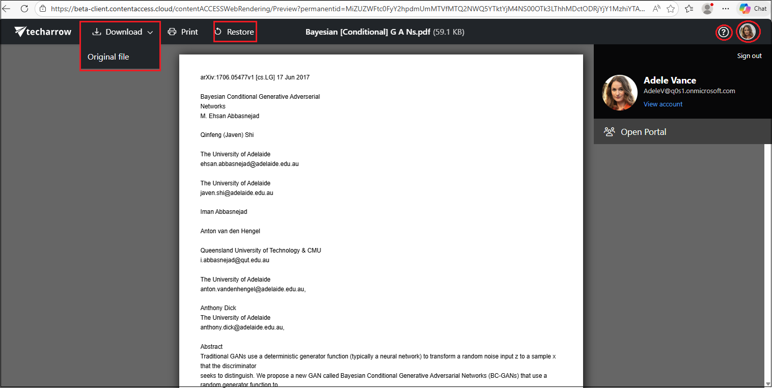 Additionally, clicking the question mark (?) opens the relevant chapter of the contentACCESS Portal manual about file previews. By clicking on the user’s profile picture (or monogram if there is no profile picture set to the logged in user) in the top-right corner, you can access the user menu to view information about the signed-in user, access their profile by clicking View account, open the folder/entity containing the archived file via Open Portal, or sign out using the Sign out option. ,